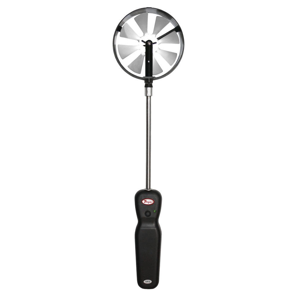 The Model VP3 Wireless 100 mm Vane Thermo-Anemometer Probe measures air velocity, air flow, humidity, and temperature when combined with the Model UHH6 Universal Handheld. By having a larger diameter, the rotating vane is able to measure velocities down to 50 fpm or 0.25 m/s. An arrow is molded into the vane housing to depict the flow direction.